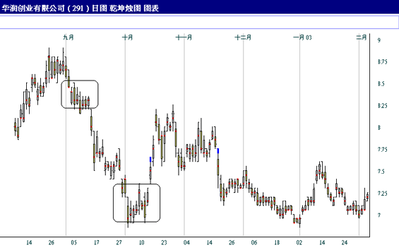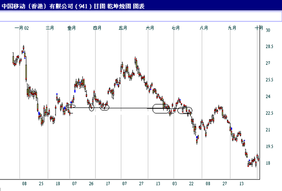 上图例显示重要的聚焦平台在大跌後出现,形成支持,再过一段时间,市况再重试此一平台。若最後失守则与传统的破底意愿相若,意味新一轮的升跌浪开始。 |