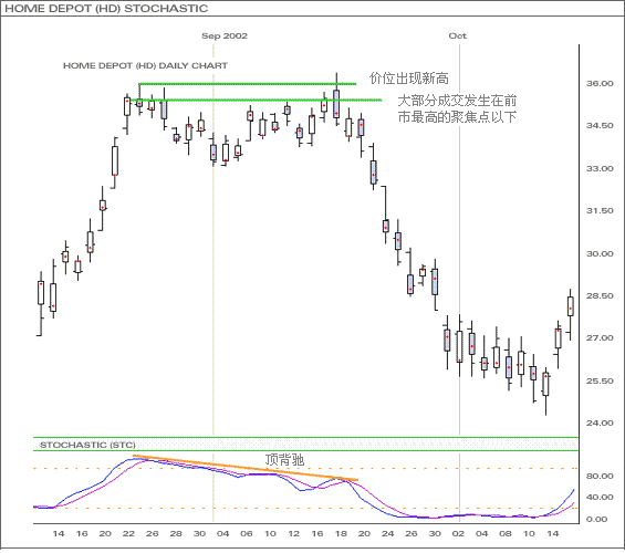 根据上例,当随机指数(STC)出现顶背驰,价位亦接近高位,这代表讯号十分强,可被视为熊市在即,同时乾坤烛也显示是熊市。当市势创新高,但大部分成交发生在前市最高的聚焦点价位以下,并且收市价亦收於前市聚焦点之阻力位以下,这代表後市缺乏买盘的潜力,所以技术指标亦指出已到高位。