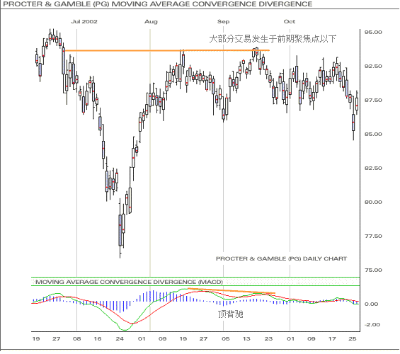 上图是另一个例子,说明运用乾坤烛的独有数据(时间和成交量)来分析传统技术指标之好处,如移动平均汇聚背驰指标(MACD)。经过一轮市况下调,价格重上前期聚焦点阻力位。其後,阻力仍然很强及大部分交易都发生於前市的阻力位以下。当价格回升,顶背驰出现在移动平均汇聚背驰指标(MACD),正代表市况处於弱势,进一步确认当前股价疲弱。