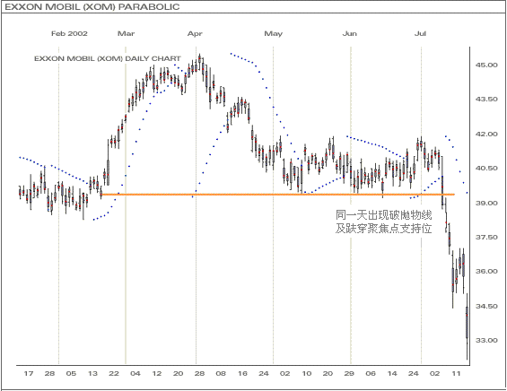 从上图可见,正下跌的抛物线(SAR)与乾坤烛的聚焦点支持位不谋而合。当价位成顶後,市况开始向下滑,直到前市的一个强而有力的聚焦点支持位。其後的两个月,价位都徘徊在支持位上盘整,直至一个很强的沽盘出现,并且开始下调。这个抛物线破位,比上一个来得更强,因此这个突破讯号与跌破聚焦点支持位同时出现。在这个例子中,又再一次印证乾坤烛怎样帮助确认传统技术指标所发出的讯号。 |